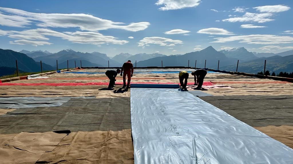 Pfähle stellen, Bretter einlegen, Teppiche auslegen, Folie ausrollen, Markus für einmal nur mit beratender Stimme (defektes Knie). Die Folie, beschwert mit den Enten (Säcke gefüllt mit Wasser), liegt wunderbar da. Der Wind war aber auch gnädig