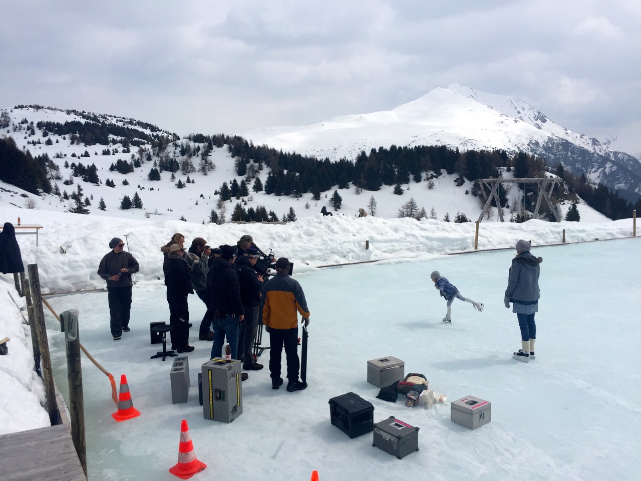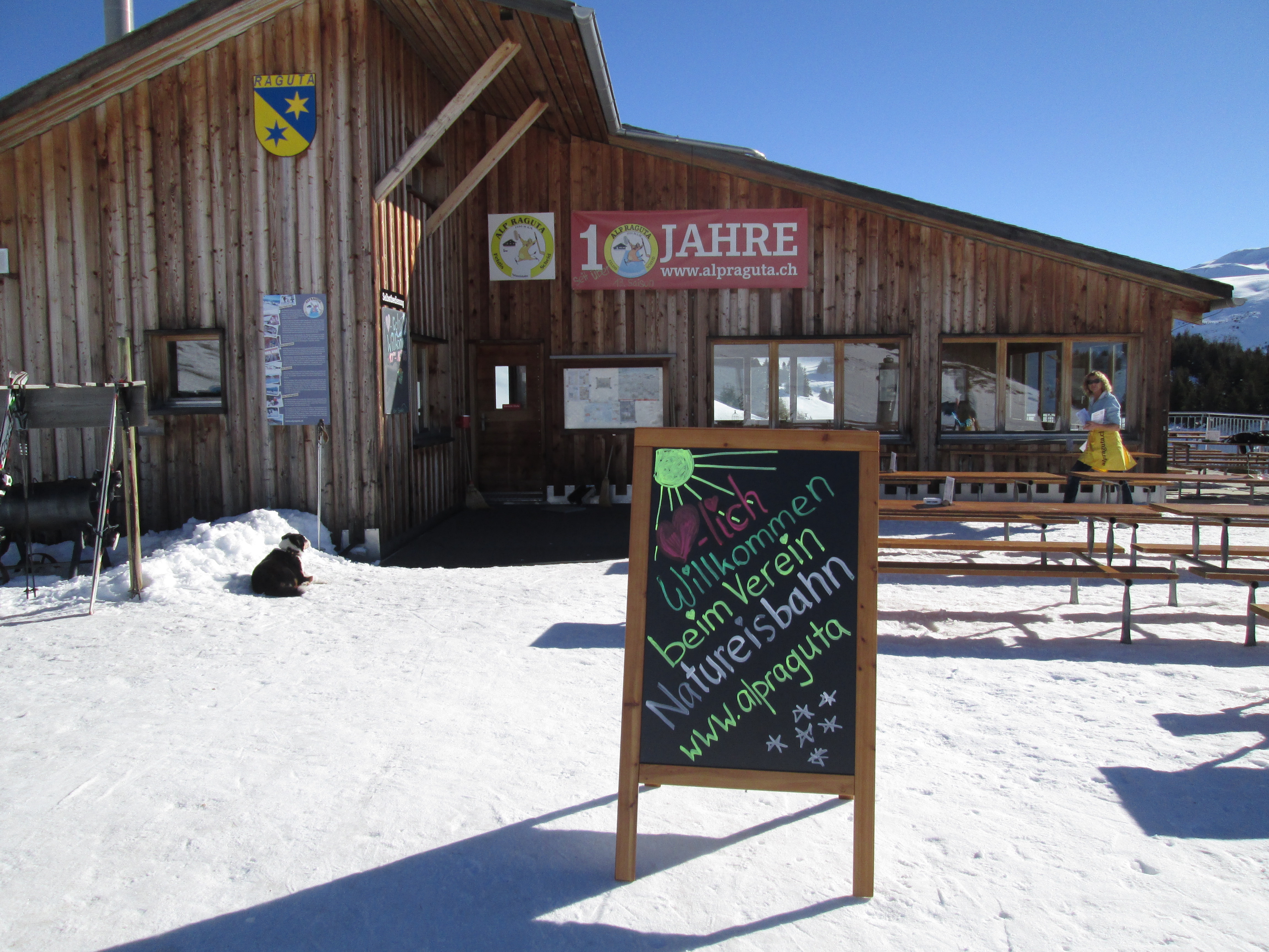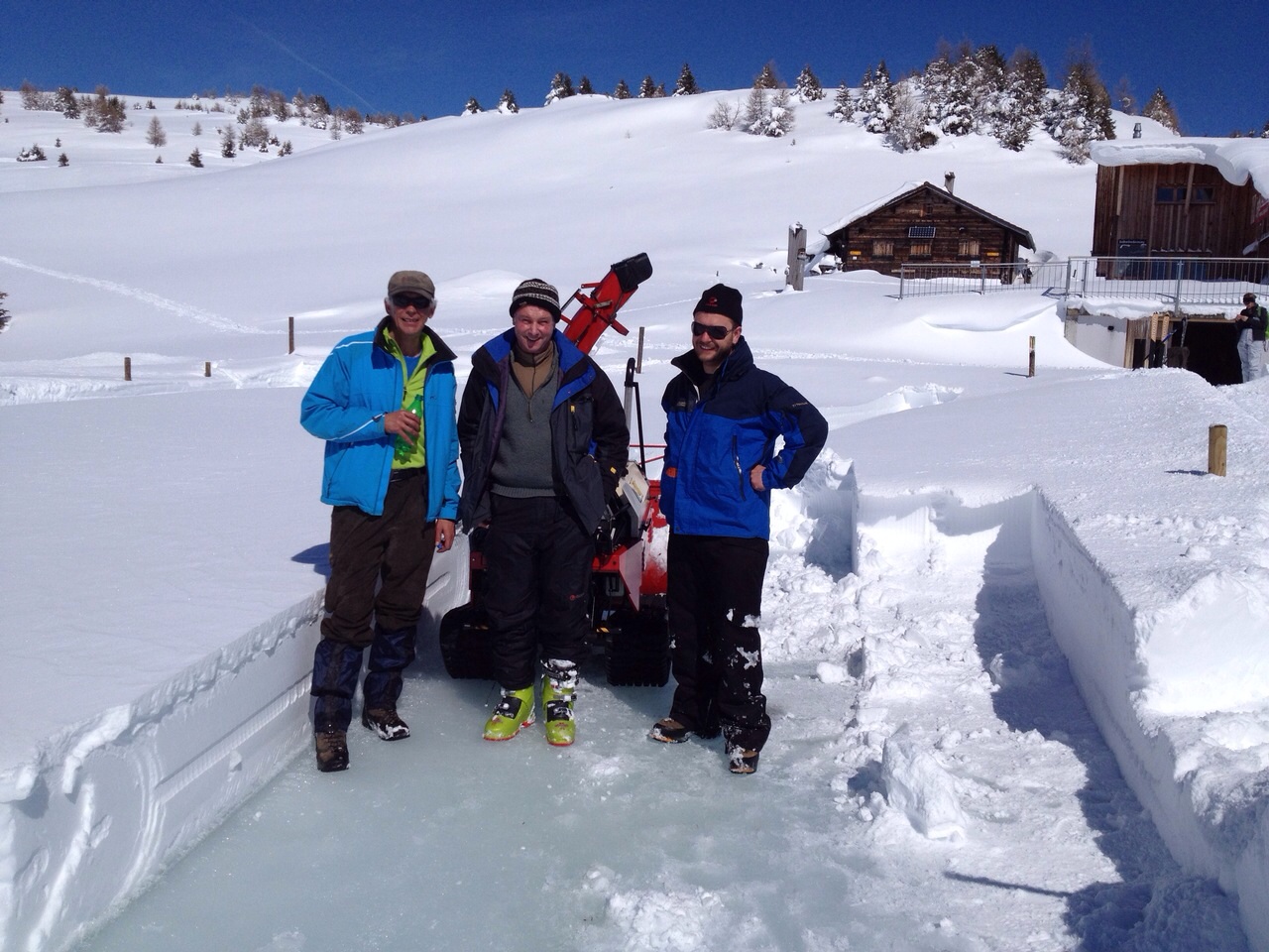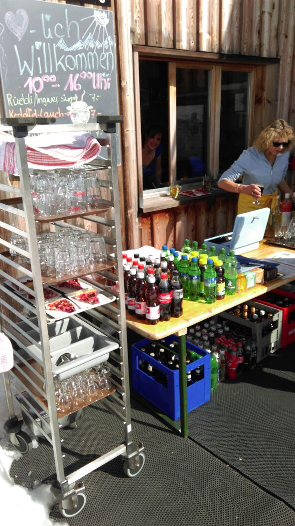 …..Im Herbst 2014 Haben wir das Eisfeld gebaut mit dem neuen «Komfort System». Ebenfalls wurde das Maluns für den Winter produziert. Den Holzschopfboden haben wir neu verlegt. Holz, das uns Enrico Kunfermann geliefert hat, versägt gespalten und im Schopf eine schöne Beige gemacht.Dann haben wir die Hütte neu gestaltet. Dieser frische Wind wird von den meisten positiv aufgenommen. Die Arbeit in der Hütte ist nochmals etwas optimiert worden mit den neuen Elementen. Der Saisonstart glückte nur halbwegs – fehlte doch der Schnee bis ende Jahr ganz. Das Eis litt unter der Wärme und musste drei Mal neu gemacht werden. Aber alle Anlässe auf dem Eis konnten durchgeführt werden und unzählige Gruppen, wie auch die noch junge Gemeinde Domleschg, genossen den Aufenthalt auf dem Berg. Die Skipiste hatte im unteren Teil meist sehr knapp Schnee aber war immer super präpariert und Schlitteln konnte man meistens recht gut.Im April kam eine total verrückter Auftrag auf uns zu. NIVEA will einen Winter Werbe Film realisieren und hat unser «Eisfeld» als Drehort auserwählt. Das ginge noch aber wir hatten genau an dem Tag wo der Entscheid fiel so viel Schnee auf dem Eis wie den ganzen Winter nie und die Sonne brannte wie selten…….